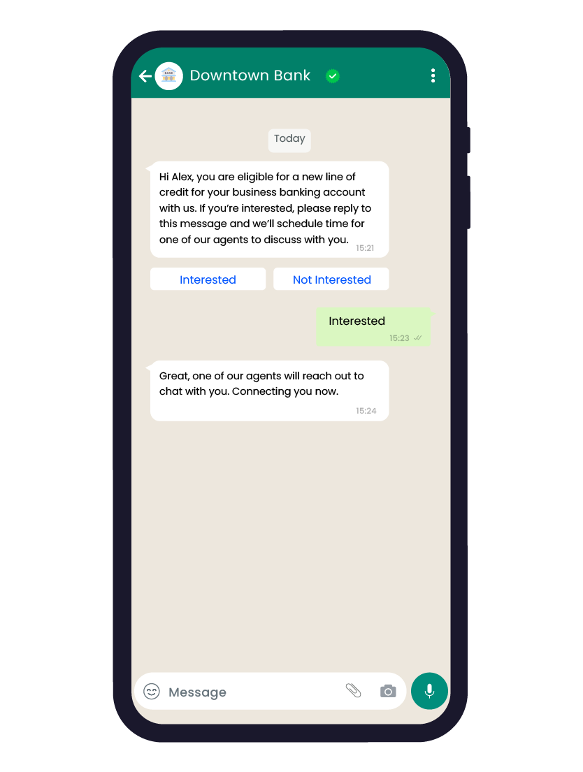 Get WhatsApp Business API for your brand! Schedule a demoOrganisations can leverage WhatsApp Business API to securely message customers directly from within WhatsApp messaging platform. It also helps developers in building interactions that reach out to customers and initiate effective customer engagements.